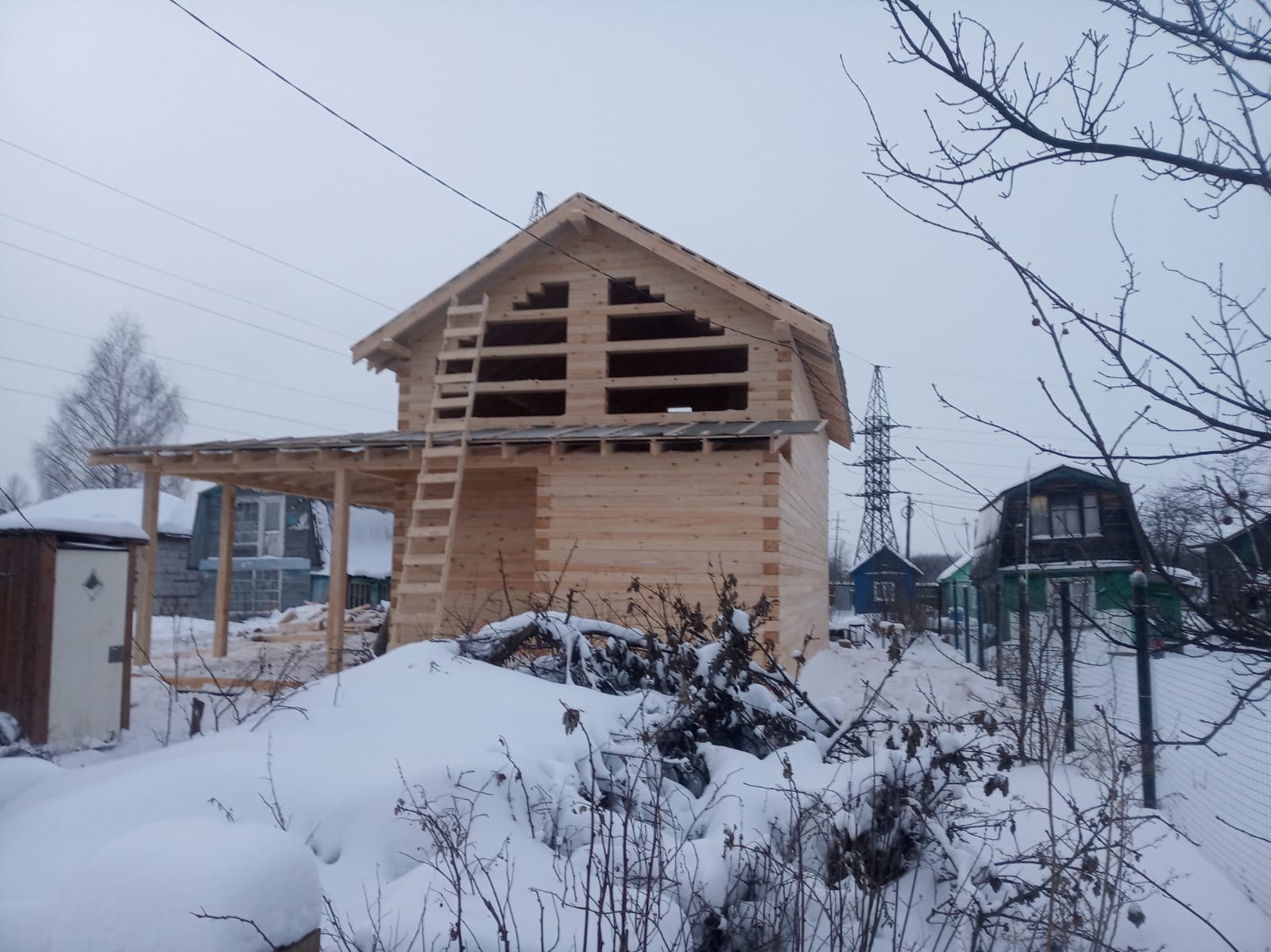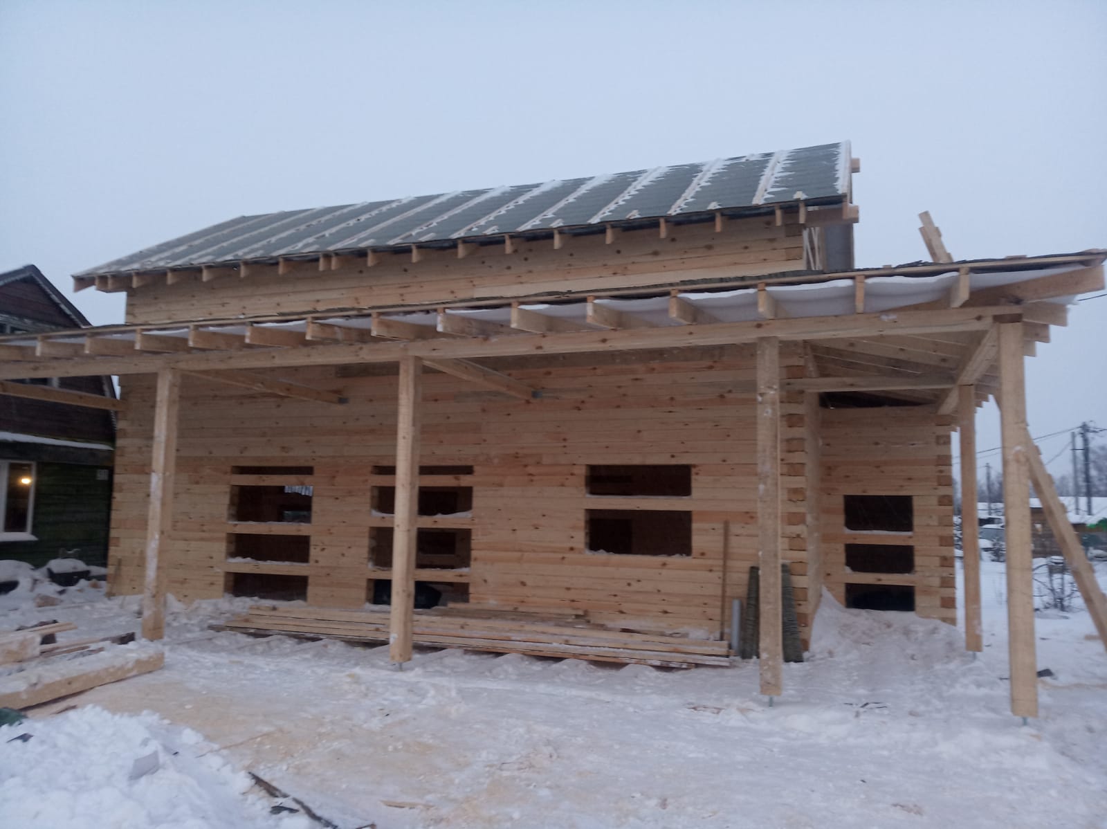 Закончено строительство небольшого полутораэтажного дома из бруса 150х200 мм естественной влажности. Дом сдан под усадку. Дальнейшие работы запланированы через несколько месяцев.