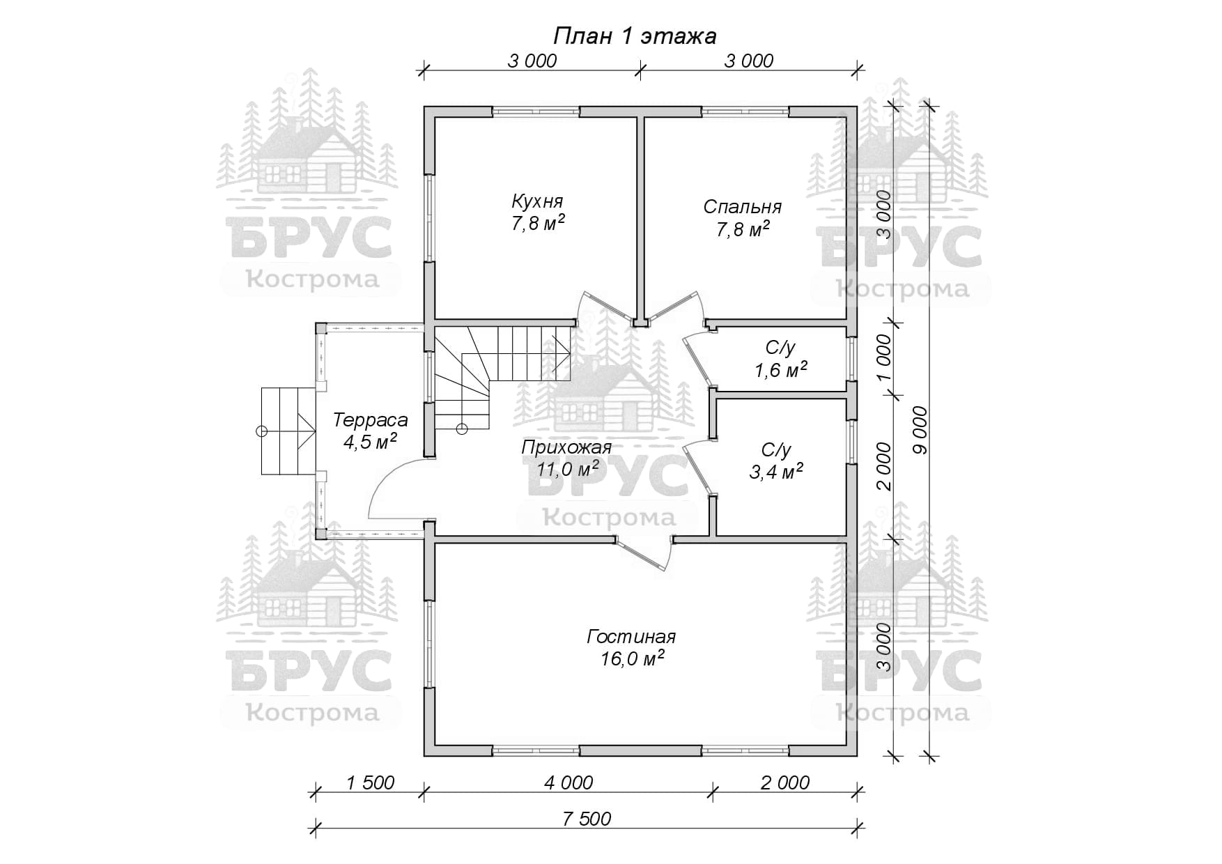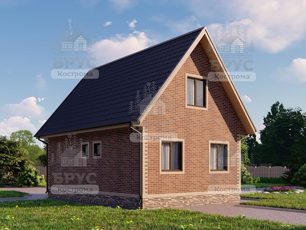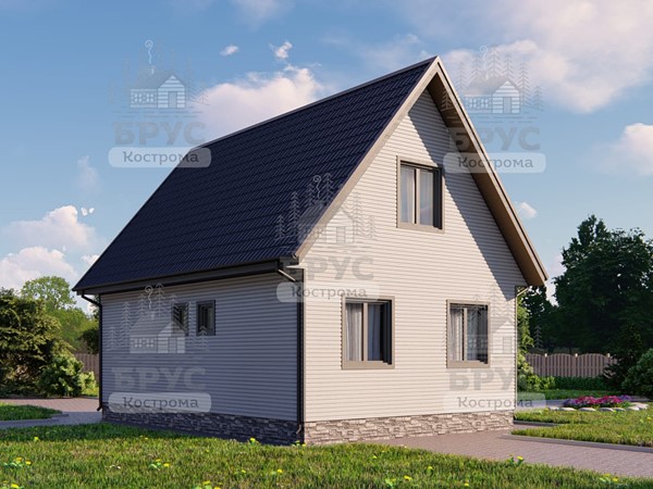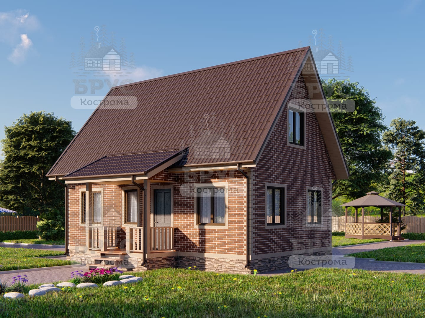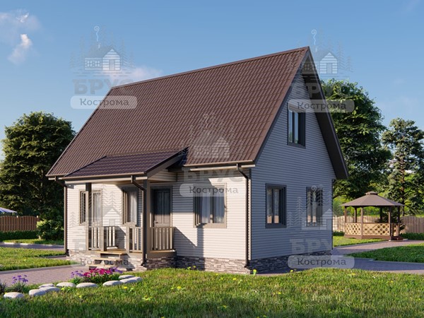 Одноэтажный дом с мансардой и крыльцом. Двухскатная крыша.
