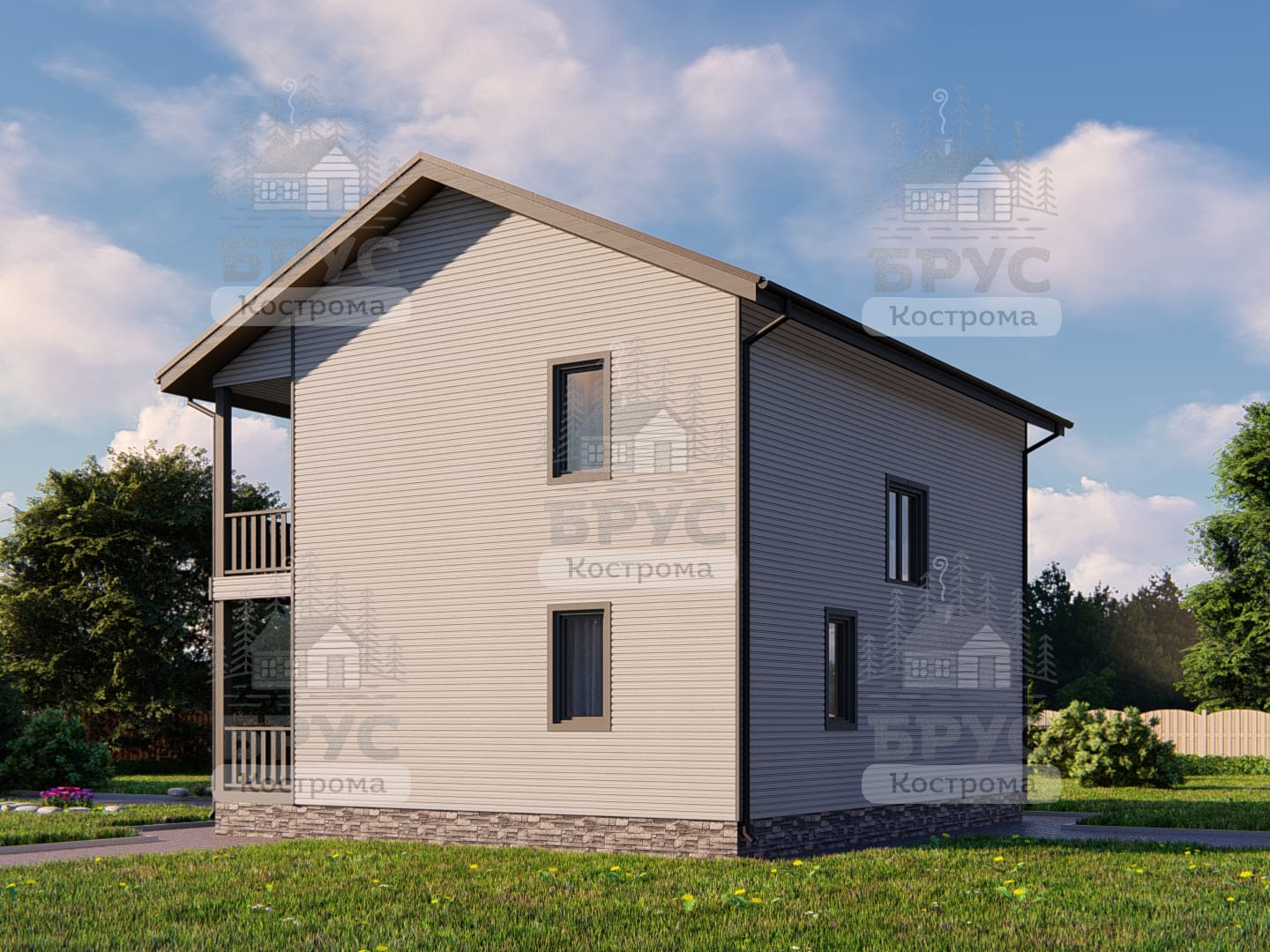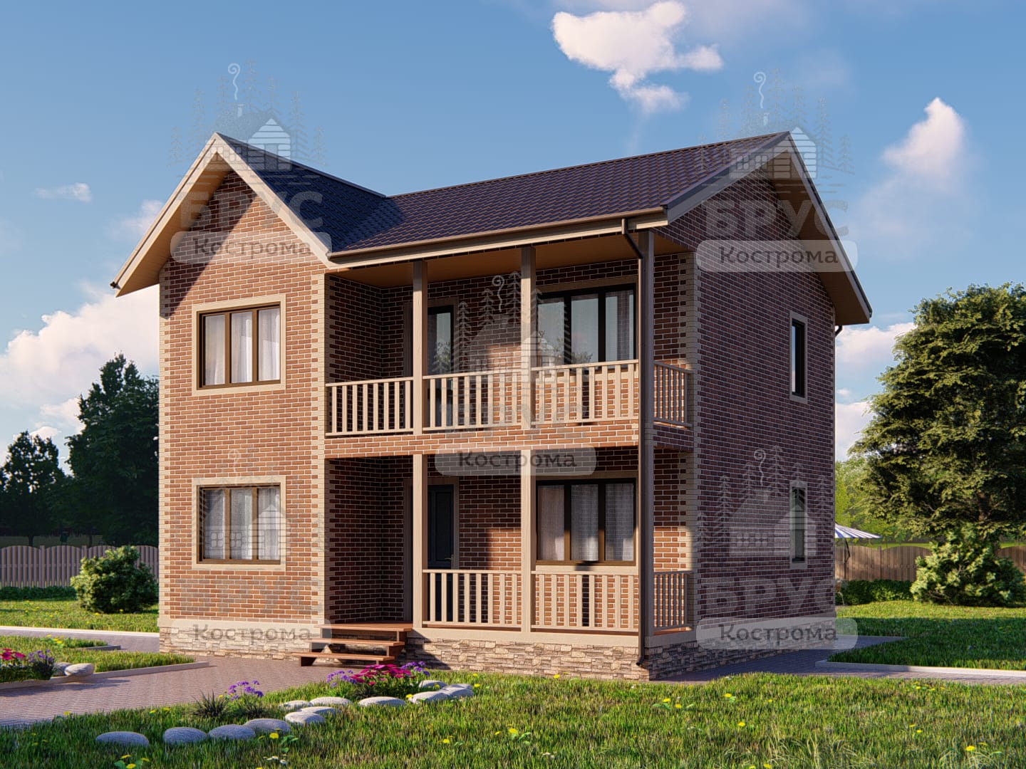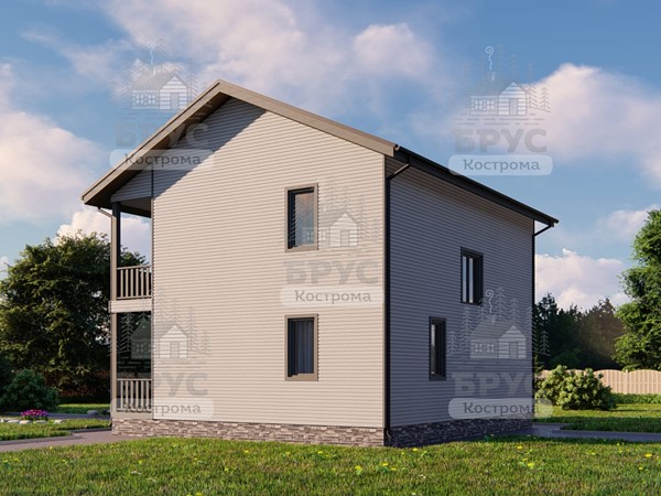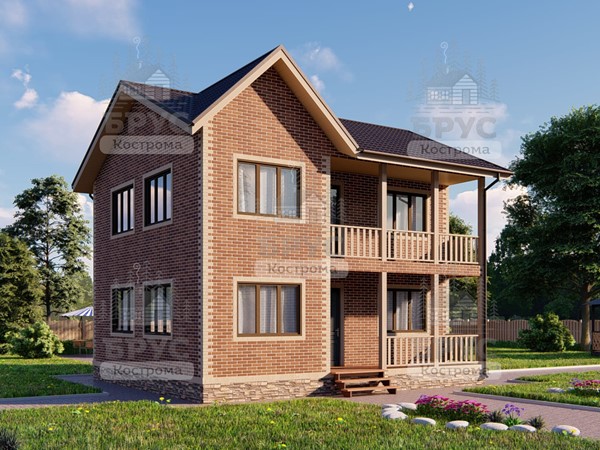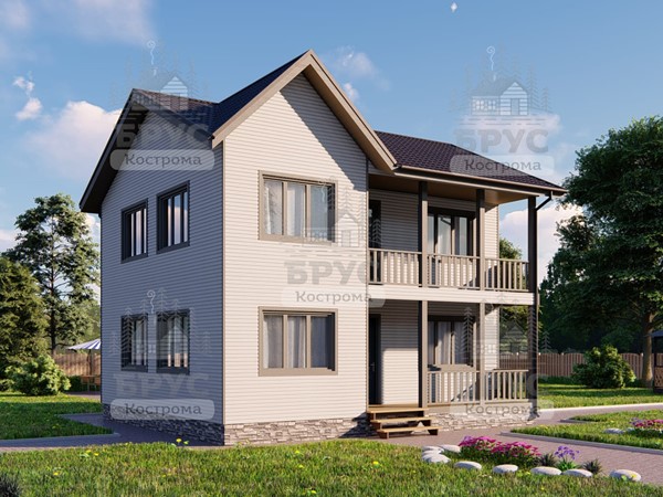 Двухэтажный дом с крыльцом и балконом.