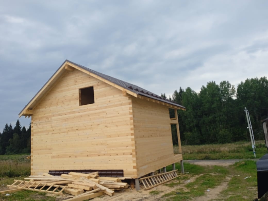 Сдан под усадку дом по проекту ДБ-99. Дом из бруса габариты 8х8 метров, полтора этажа, крыша из металлочерепицы, фундамент - железо-бетонные сваи. Срок возведения около 1 месяца.