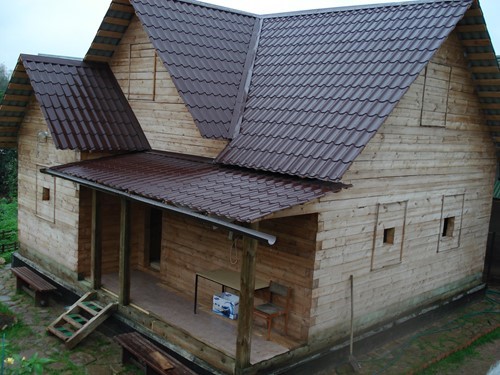 Преимущества монтажа постоянной кровли для дома из бруса под усадку очевидны. Это, в первую очередь, экономия средств. Рубероид хоть и является дешевым кровельным материалом, но для перекрытия крыши сложной формы требуется его значительное количество, поэтому монтаж временной кровли может влететь вам «в копеечку». Постоянную кровлю на дом из бруса можно установить в конце строительного сезона. Межсезонья в большинстве регионов нашей страны вполне достаточно для завершения всех усадочных процессов, поэтому с началом нового строительного сезона можно сразу приступать к отделочным работам, то есть не тратить время и деньги на замену временного укрывного материала на постоянный.