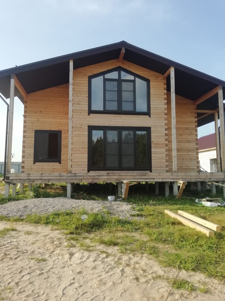 Построен роскошный двухэтажный дом из бруса естественной влажности 150х150 мм. С фасада пластиковые панорамные окна почти во весь человеческий рост. Окна выходят на все 4 стороны на обоих этажах дома. Фундамент из железобетонных свай. Крыша двухскатная тупоугольная.