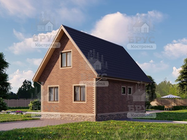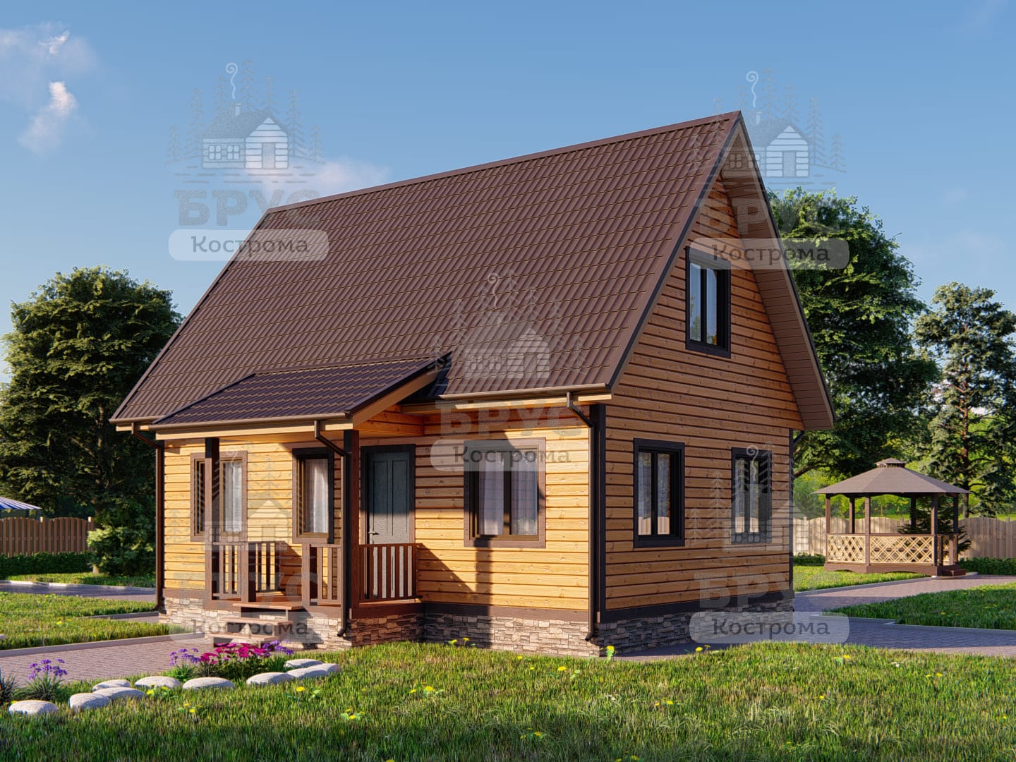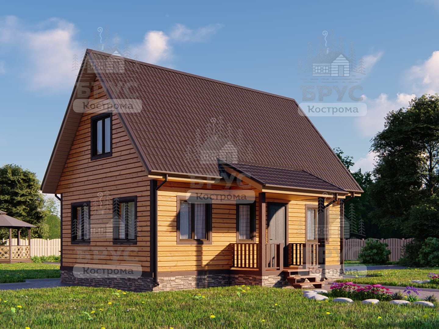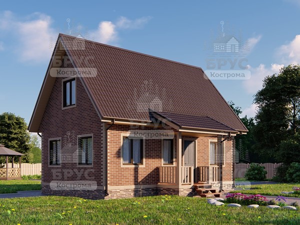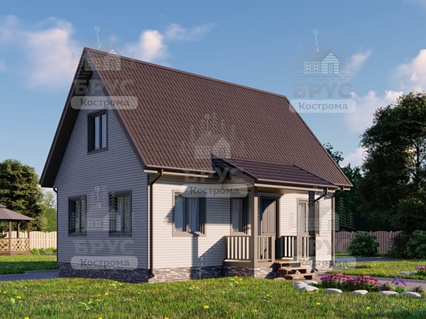 Одноэтажный дом с мансардой и крыльцом. Двухскатная крыша.
