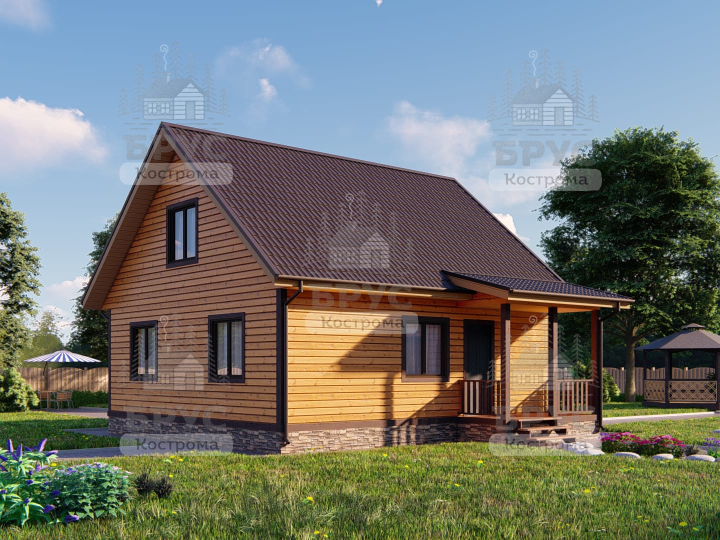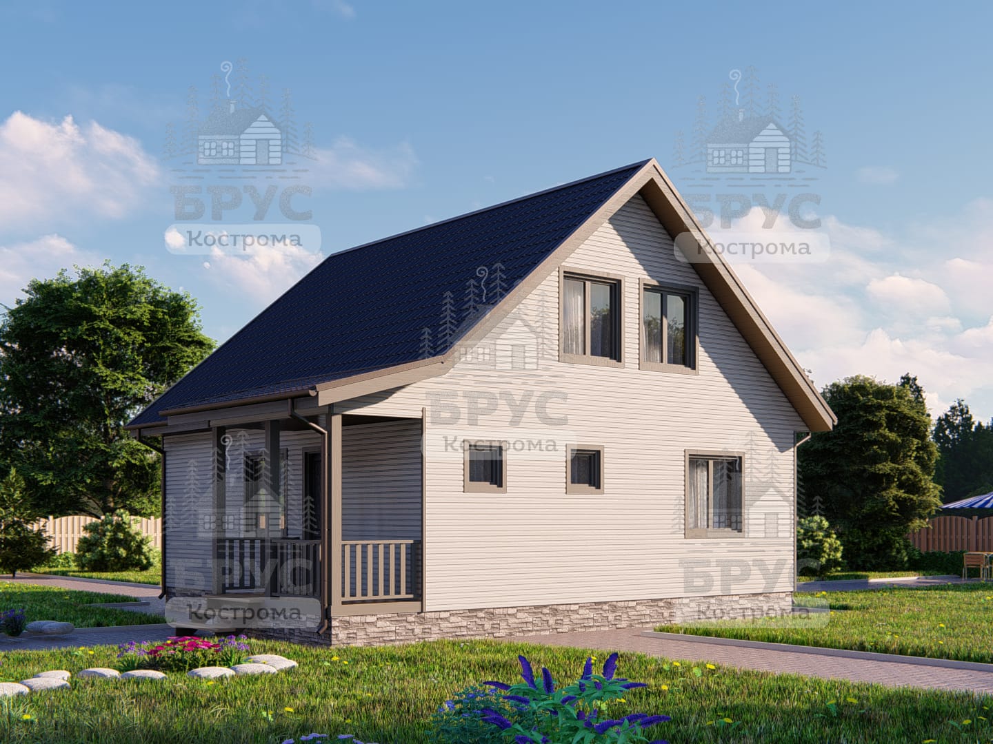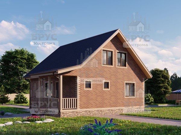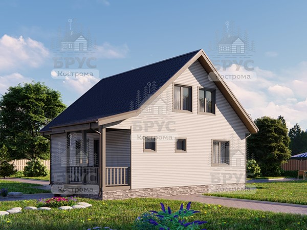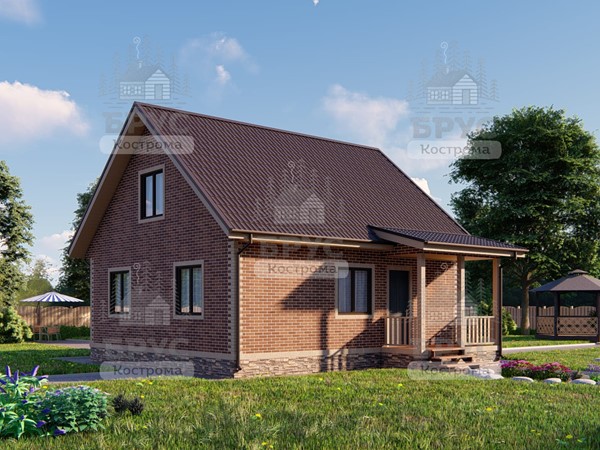 Одноэтажный дом с мансардой и крыльцом. Двухскатная крыша.