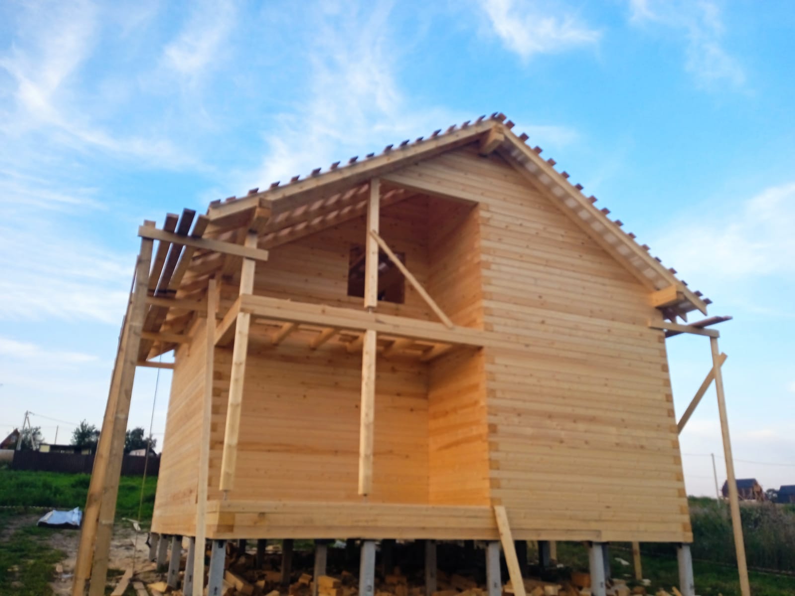 Сдан под усадку дом по проекту ДБ-99. Дом из бруса габариты 8х8 метров, полтора этажа, крыша из металлочерепицы, фундамент - железо-бетонные сваи. Срок возведения около 1 месяца.